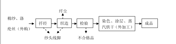 工藝流程說明: 本項(xiàng)目生產(chǎn)工藝較為簡(jiǎn)單,原材料外購后經(jīng)扦經(jīng)、織造,然后進(jìn)行檢驗(yàn),經(jīng)檢驗(yàn)合格的產(chǎn)品委外染色、涂層、蒸汽烘干等處理即成成品。本項(xiàng)目不設(shè)鍋爐。 根據(jù)對(duì)項(xiàng)目實(shí)際建設(shè)情況和審批情況對(duì)照,項(xiàng)目實(shí)施地點(diǎn),生產(chǎn)工藝、規(guī)模、生產(chǎn)設(shè)備及原輔材料、環(huán)保設(shè)施等與環(huán)評(píng)報(bào)告表基本一致。項(xiàng)目無重大變動(dòng)。 本項(xiàng)目不產(chǎn)生生產(chǎn)廢水,外排廢水主要為職工生活污水,因此本項(xiàng)目不需區(qū)域替代削減進(jìn)行平衡。 |